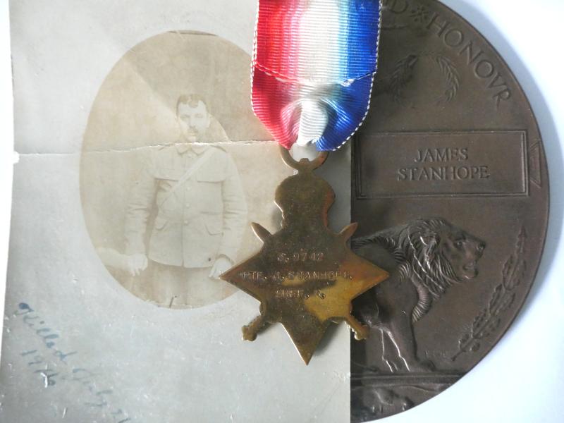 1914/15 STAR TRIO,PLAQUE AND ORIGINAL PHOTO TO STANHOPE-SUFFOLK REGT-KILLED IN ACTION ON 21/07/1916-FROM LONG MELFORD-SUFFOLK