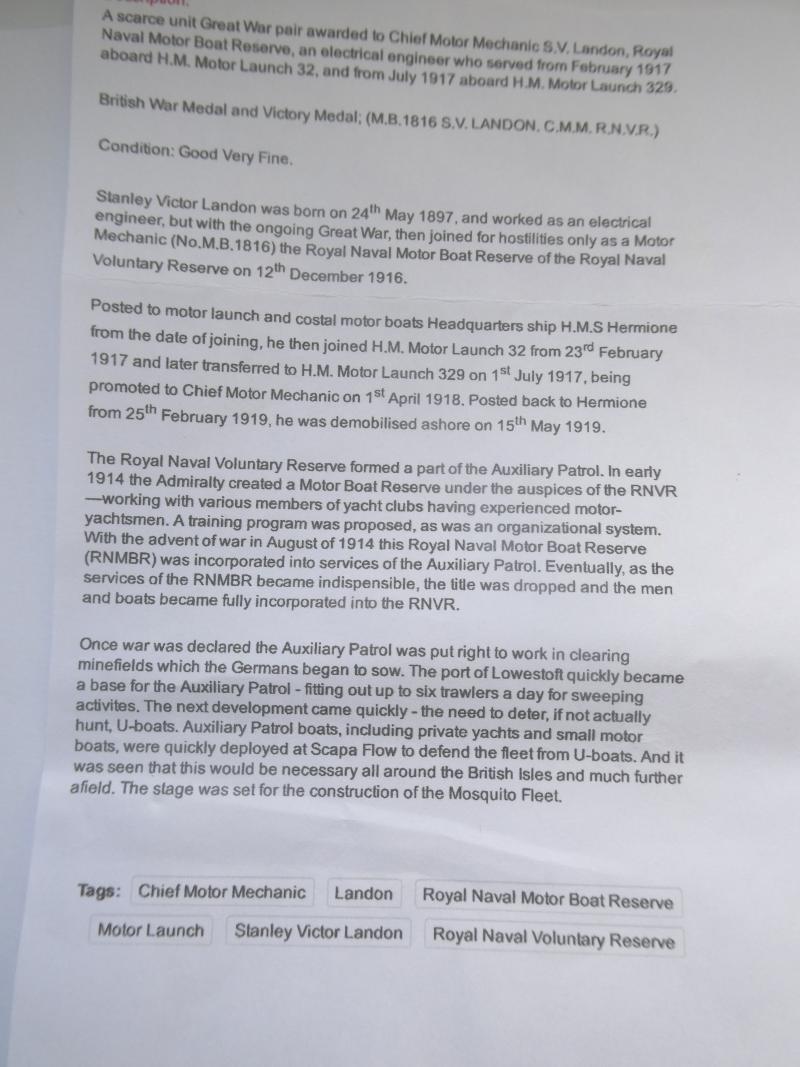 BRITISH WAR AND VICTORY MEDALS TO LANDON-ROYAL NAVAL VOLUNTEER RESERVE-SERVED ON MOTOR LAUNCHES 32 AND 329